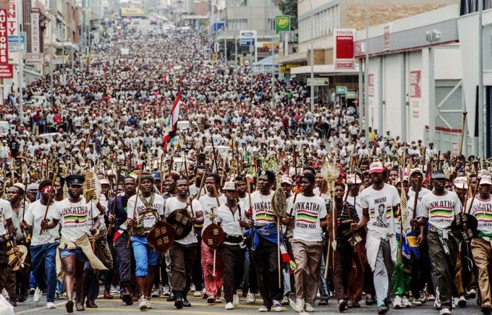 But nobody has enjoyed the spoils of revisionist history for as long, and for as uncritically, as Prince Buthelezi. When we collectively got fatigued from the "Rainbow Nation" fever dream, we skewered white South Africans for thinking that a vote in the sham 1992 "election" would act as a way to avoid culpability in upholding a racist system for half a century. We all knew that the ANC did bad things in exile, but we sighed, raised our shoulders, and reasoned that all was fair in love and war, even a few human rights abuses here and there.